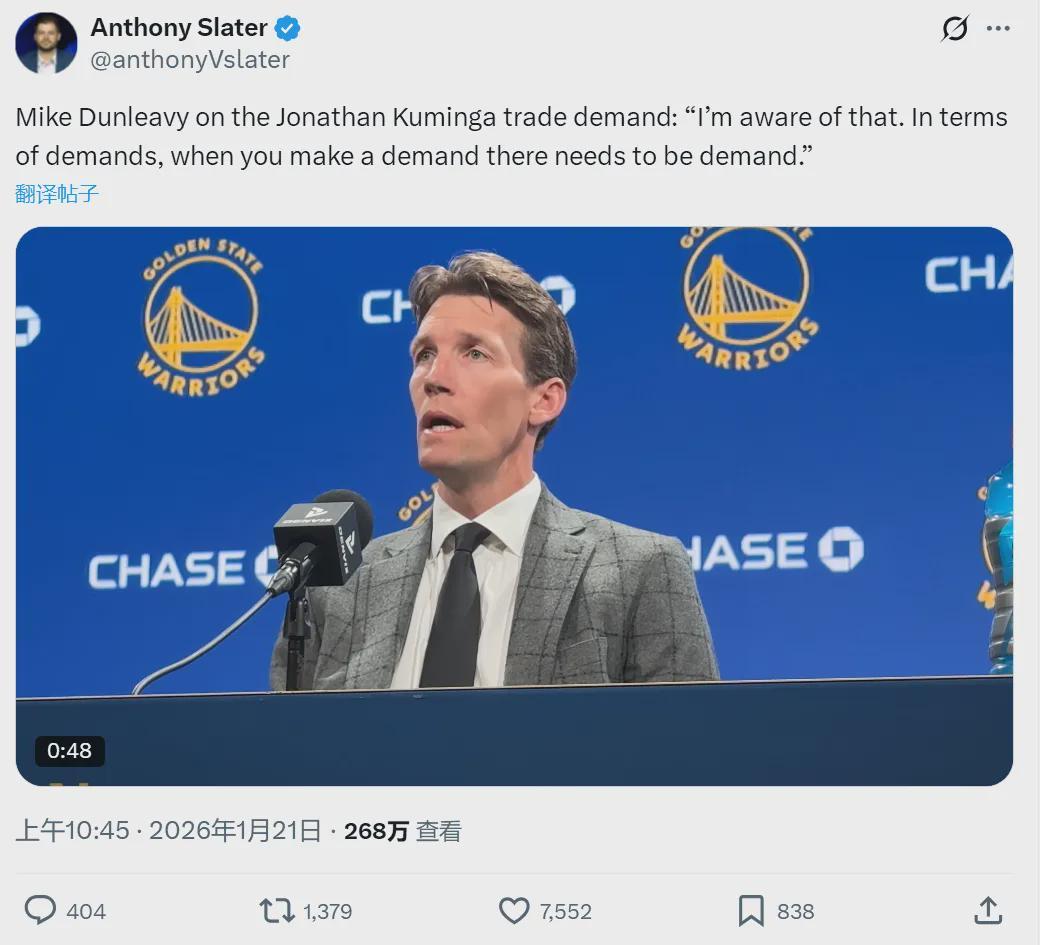 很多媒体人都表示,库明加可能打完了在勇士的最后一场比赛。今天赛前,NBA名记Chris Haynes爆料,库明加和科尔的关系已经不可修复,库明加仍然要求勇士在截止日前把自己交易送走。现在距离交易截止日,只剩下13天了!